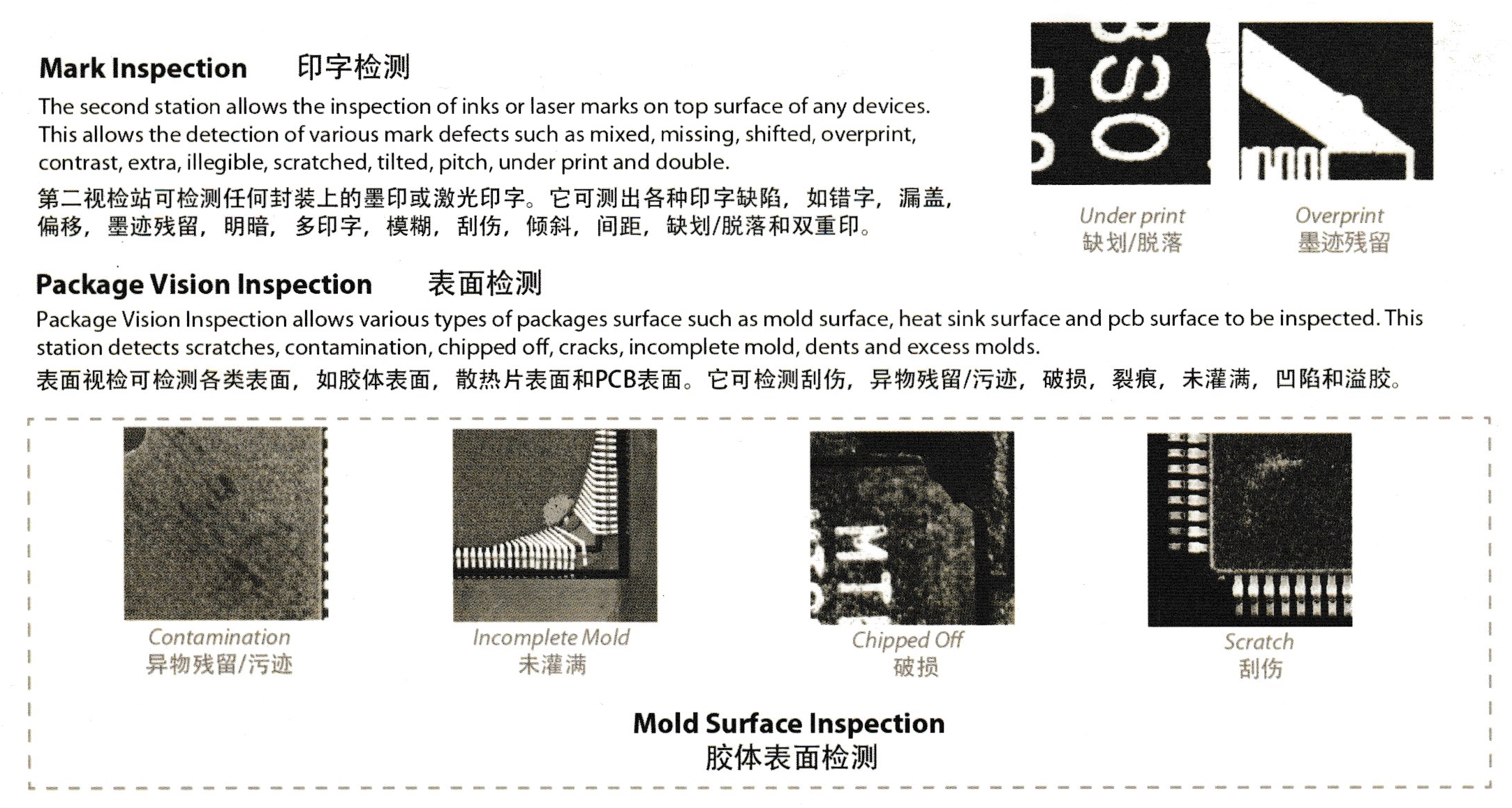 | Vision Inspection | 3D Vision Inspection, Leaded Packages Inspection, Ball Packages Inspection, Leadless Packages Inspection, Top 3D POP Inspection, 2D Barcode Inspection, Mark Inspection, Package Vision Inspection, Passive Component Inspection, Top Color Inspection |